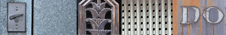 | In Commonly Used Metal," close-up views depict various metals and alloys. Other sections show a variety of architectural applications, and are identified, when appropriate, as to the type, manufacturing process, finish, and patina. Pictures give a variety of periods, styles and weathered conditions. Terms and finishing techniques used in the captions are explained in the glossary. To view all the pictures in this chapter visit www.planetprepro.com. | |||||||||